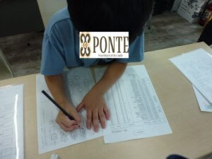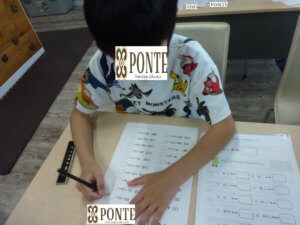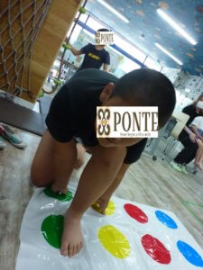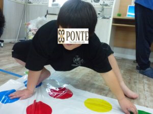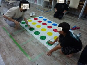 新聞紙の上に乗って、先生とじゃんけんをします。