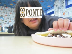 トッピングにはみんな大好きポイップクリームの他にあんこや黒蜜など和の材料も用意しました。一番人気はやっぱりホイップクリームとチョコソース🍫美味しそうにほおばると口の周りはべとべとでした☻
