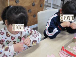 工作( ^^) こんにちは、ぽんてステラの丹です。 今日はみんなで来月のカレンダー作りをしました。 赤やピンクの色紙を小さくちぎちぎ。 ちぎった紙を大きなハートの形に貼っていきます♡ かわいいハートカレンダーが出来ました。 寒い日が続き風邪も流行っているので みなさんもお気をつけて🌞